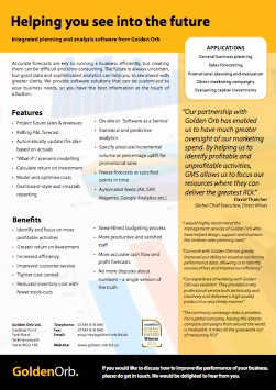 Golden Orb specialises in providing tools for business planning and analysis – delivering far greater accuracy, detail and security than the spreadsheets used by most organisations. Our cloud-based Compas software is used by all business functions to build accurate and granular forecasts, and then provide detailed evaluation of performance against plan.
